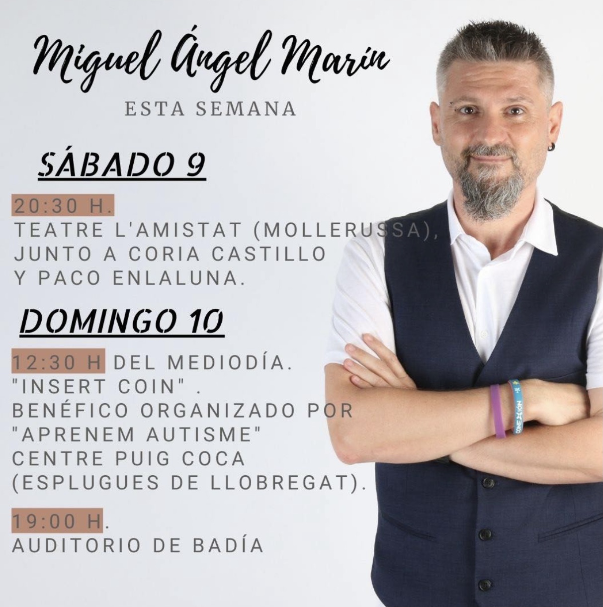 Pero no dejo de ser “el Miguel”. Un filósofo de barrio que intenta cambiar el mundo a base de golpes de humor, que se sube a un escenario a ser tu amigo, a darte cercanía, un tipo próximo con ciertas pintas de gamberrete que ha vivido lo que le tocaba y lo que venía de regalo, un ciudadano de barrio pero elegante, que ha crecido y sigue siendo de Badia del Vallès. Un poco anarca y algo torpe con las redes sociales, porque la imagen la cuidamos a base de contacto del de verdad, del de toda la vida, del de mirarse a los ojos y echarse unas birras. Y mi humor es así, cercano, directo y desvergonzado, pero elegante. Que lo cortés no quita lo valiente y el chascarrillo facilón no es lo mío.
